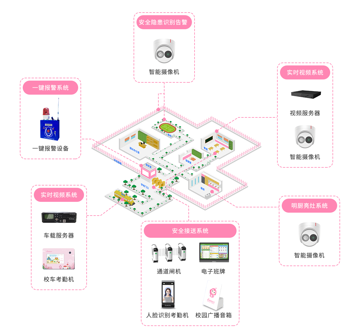 與公安部門(mén)聯(lián)網(wǎng),一鍵快速報(bào)警,視頻上推共 享,園所警情及時(shí)處理